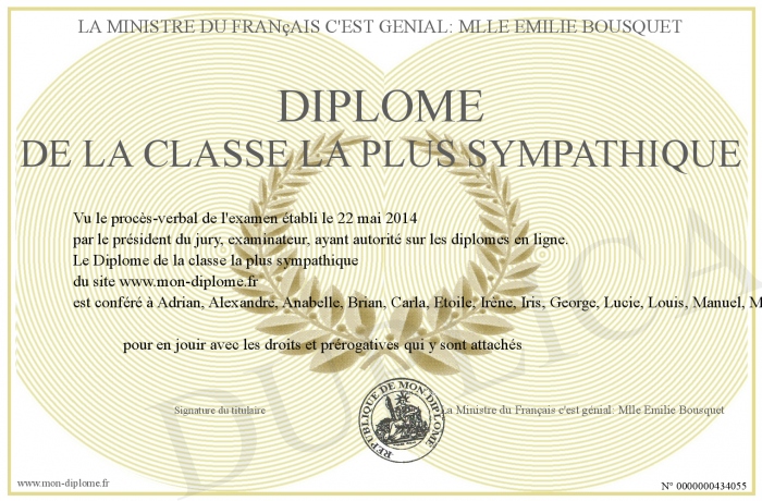 Envoyez par email votre Diplôme de la classe la plus sympathique personalisé