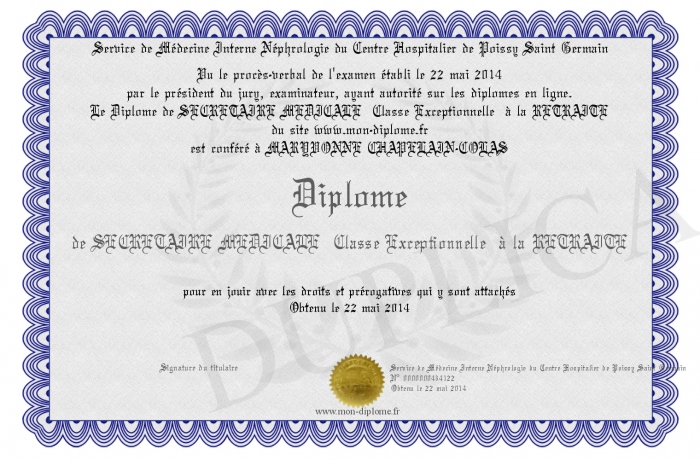 Envoyez par email votre Diplome de SECRETAIRE MEDICALE Classe Exceptionnelle à la RETRAITE personalisé