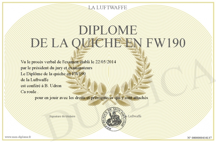 Envoyez par email votre Diplôme de la quiche en fw190 personalisé