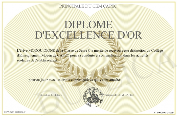 Envoyez par email votre DIPLOME D'EXCELLENCE D'OR personalisé