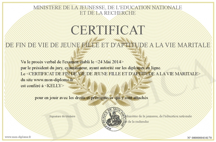 Envoyez par email votre CERTIFICAT DE FIN DE VIE DE JEUNE FILLE ET D'APTITUDE A LA VIE MARITALE personalisé