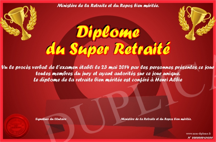 Envoyez par email votre Diplôme du Super Retraité personalisé