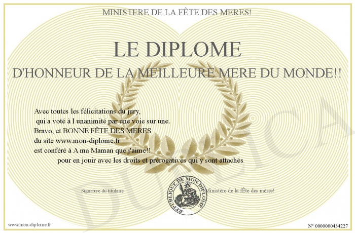 Envoyez par email votre Le diplôme d'honneur de la meilleure mère du monde!! personalisé