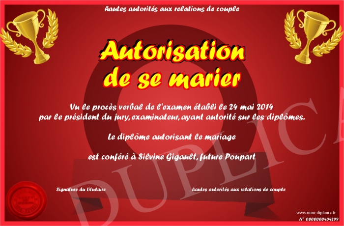 Envoyez par email votre Autorisation de se marier personalisé