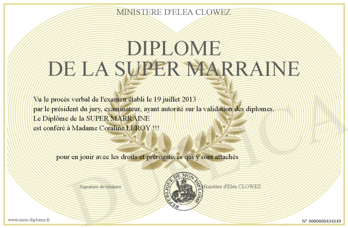 Envoyez par email votre Diplôme de la super marraine personalisé