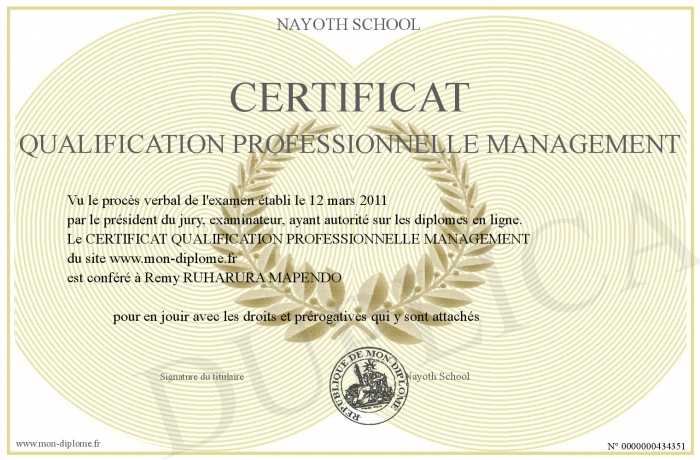 Envoyez par email votre CERTIFICAT QUALIFICATION PROFESSIONNELLE MANAGEMENT personalisé