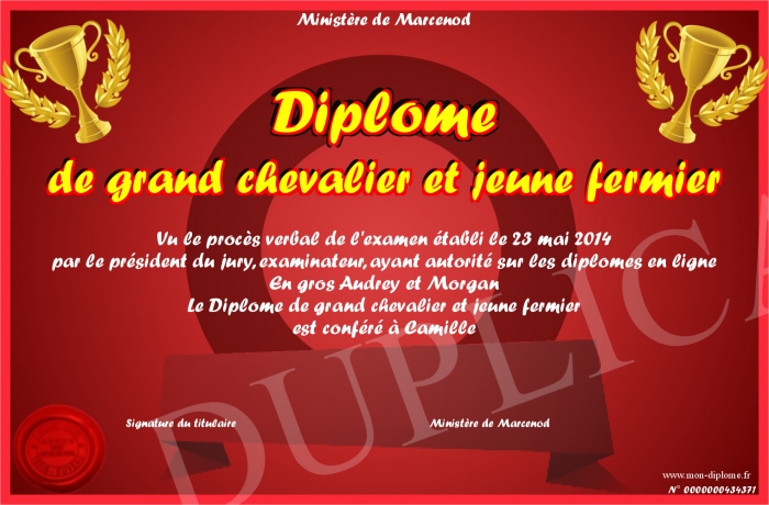 Envoyez par email votre Diplôme de grand chevalier et jeune fermier personalisé