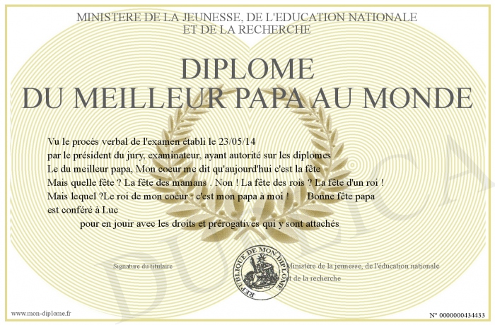 Envoyez par email votre Diplôme du Meilleur Papa au Monde personalisé