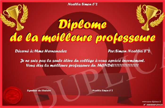 Envoyez par email votre Diplôme de la meilleure professeure personalisé