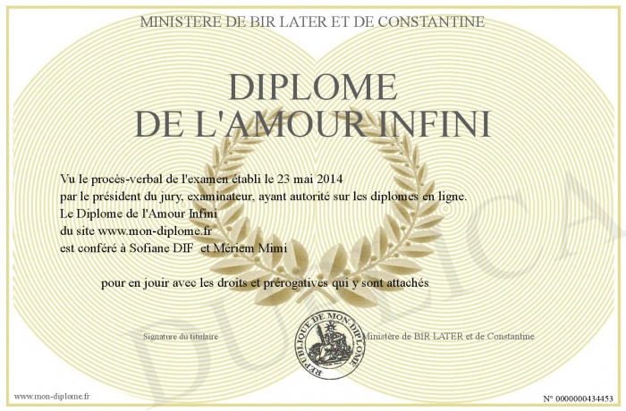 Envoyez par email votre Diplôme de l'Amour Infini personalisé