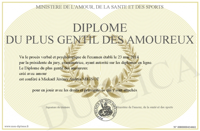 Envoyez par email votre Diplôme du plus gentil des amoureux personalisé