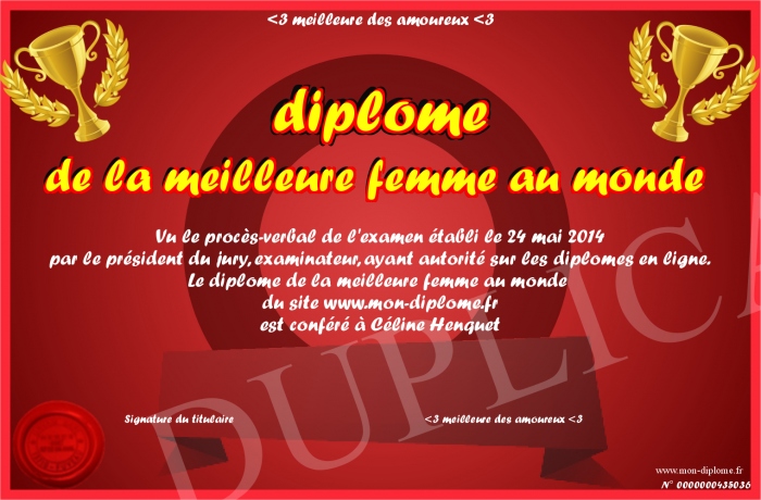 Envoyez par email votre diplome de la meilleure femme au monde personalisé