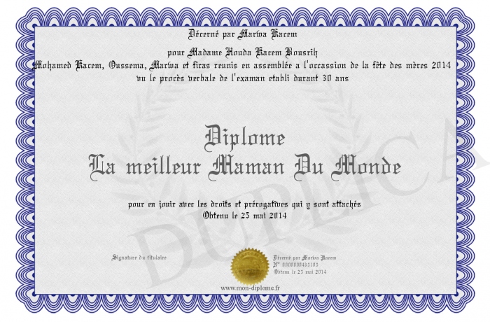 Envoyez par email votre Diplôme La meilleur Maman Du Monde personalisé