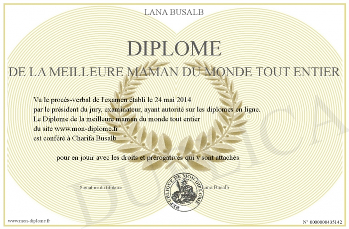 Envoyez par email votre Diplôme de la meilleure maman du monde tout entier personalisé
