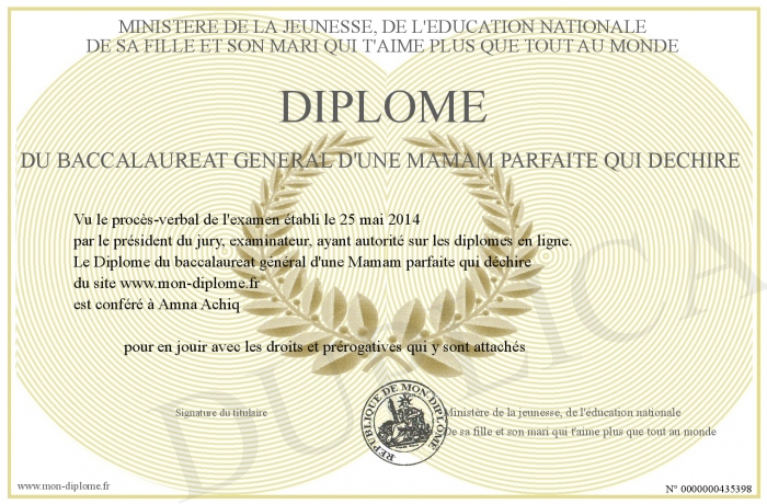 Envoyez par email votre Diplôme du baccalaureat général d'une Mamam parfaite qui déchire personalisé