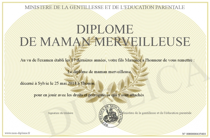 Envoyez par email votre Diplôme de maman merveilleuse personalisé