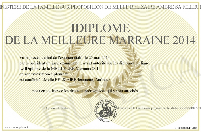 Envoyez par email votre IDiplôme de la MEILLEURE Marraine 2014 personalisé