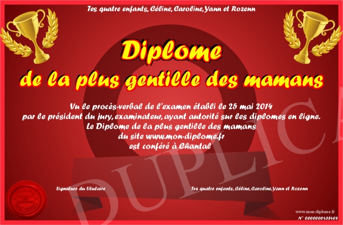 Envoyez par email votre Diplôme de la plus gentille des mamans personalisé