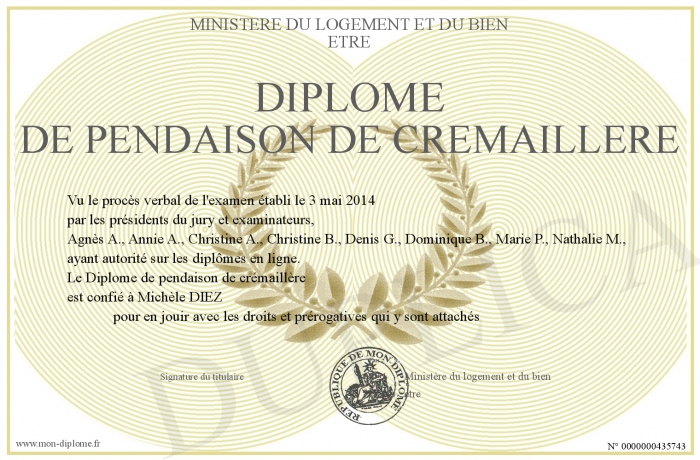 Envoyez par email votre Diplôme de pendaison de crémaillère personalisé