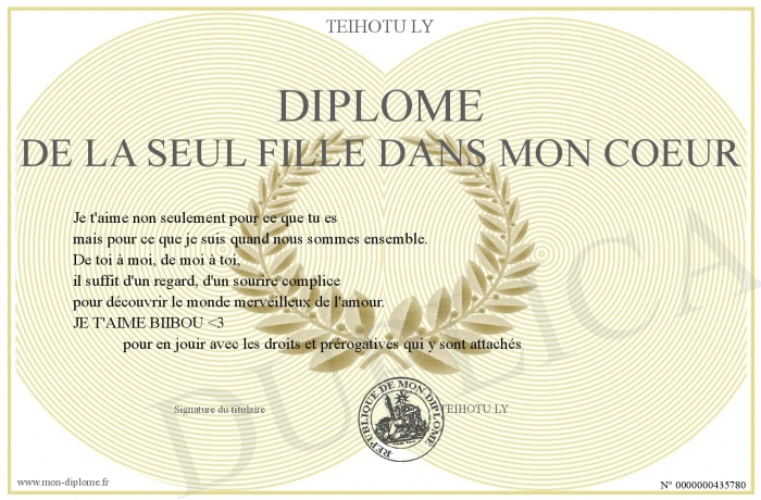 Envoyez par email votre Diplôme de La Seul Fille Dans mon Coeur personalisé