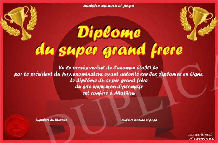 Envoyez par email votre Diplôme du super grand frere personalisé