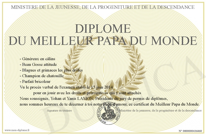 Envoyez par email votre Diplôme du meilleur Papa du Monde personalisé