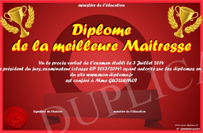 Envoyez par email votre Diplome de la meilleure Maitresse personalisé