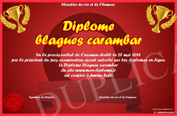 Envoyez par email votre Diplome blagues carambar personalisé