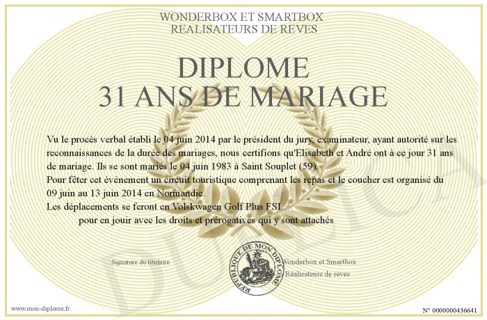 Envoyez par email votre Diplôme 31 ans de mariage personalisé