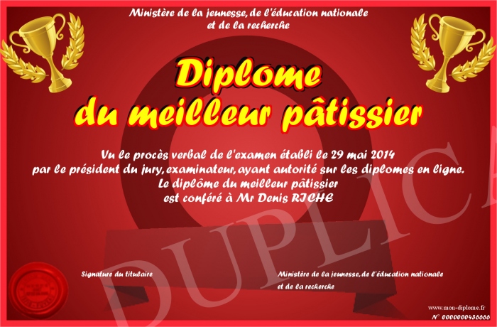 Envoyez par email votre Diplôme du meilleur pâtissier personalisé