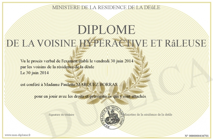 Envoyez par email votre Diplôme de la voisine hyperactive et râleuse personalisé