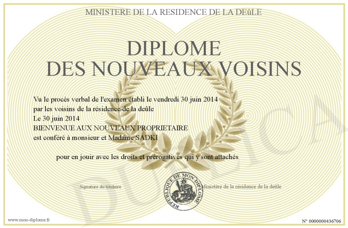 Envoyez par email votre Diplôme des nouveaux voisins personalisé