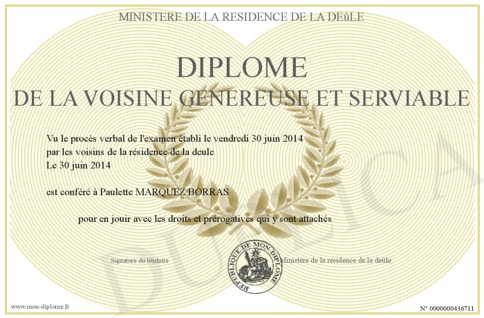 Envoyez par email votre Diplôme de la voisine généreuse et serviable personalisé
