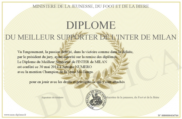 Envoyez par email votre Diplôme du Meilleur Supporter de l'INTER de MILAN personalisé