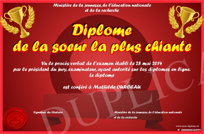 Envoyez par email votre Diplome de la soeur la plus chiante personalisé