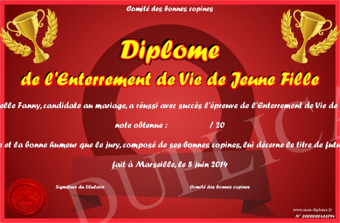 Envoyez par email votre Diplôme de l'Enterrement de Vie de Jeune Fille personalisé