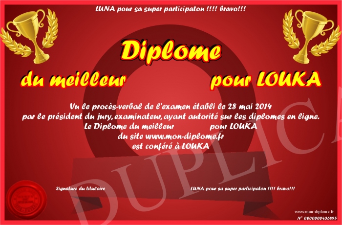 Envoyez par email votre Diplôme du meilleur pour LOUKA personalisé
