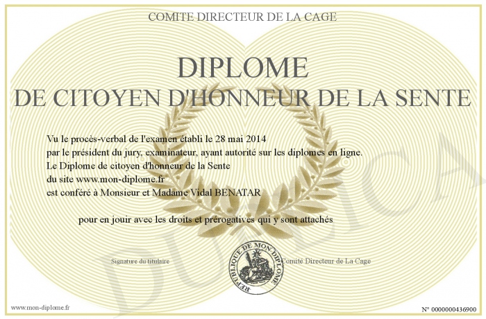 Envoyez par email votre Diplôme de citoyen d'honneur de la Sente personalisé