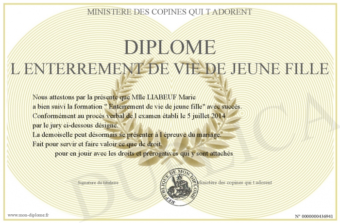 Envoyez par email votre Diplôme l enterrement de vie de jeune fille personalisé
