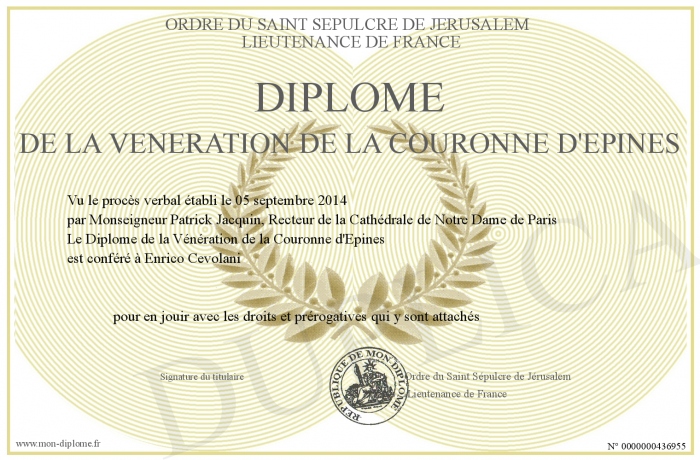Envoyez par email votre Diplôme de la Vénération de la Couronne d'Epines personalisé