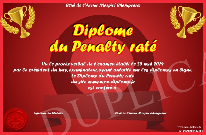 Envoyez par email votre Diplôme du Penalty raté personalisé