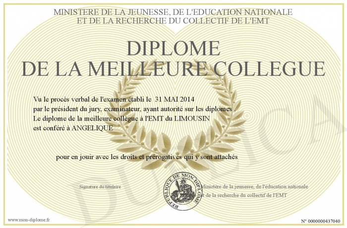 Envoyez par email votre Diplôme de la meilleure collègue personalisé
