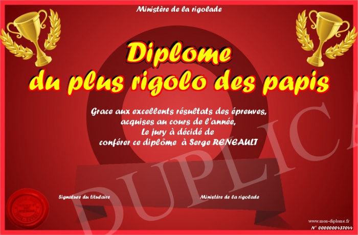 Envoyez par email votre Diplôme du plus rigolo des papis personalisé