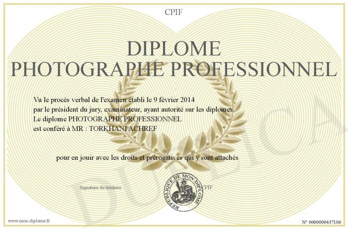 Envoyez par email votre diplôme PHOTOGRAPHE PROFESSIONNEL personalisé