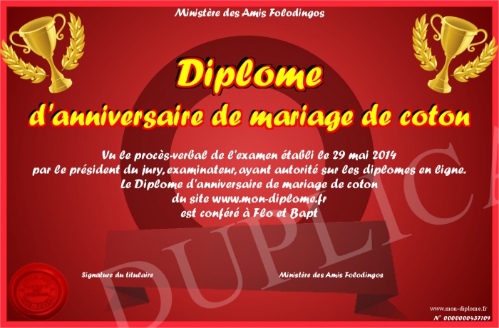 Envoyez par email votre Diplôme d'anniversaire de mariage de coton personalisé
