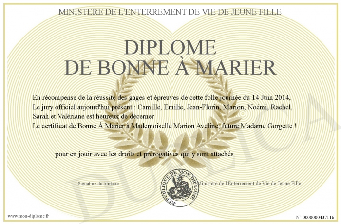 Envoyez par email votre Diplôme de Bonne À Marier personalisé
