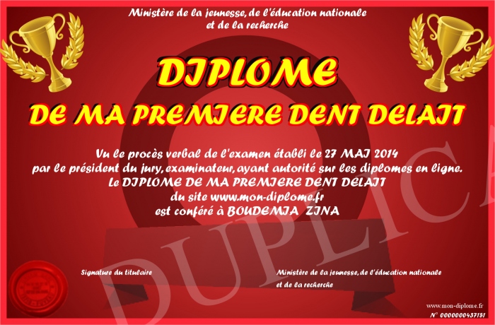 Envoyez par email votre DIPLOME DE MA PREMIERE DENT DELAIT personalisé