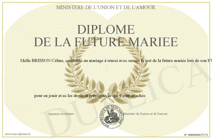 Envoyez par email votre Diplôme de la future mariée personalisé