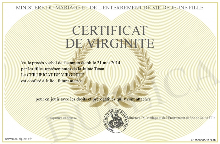 Envoyez par email votre CERTIFICAT DE VIRGINITE personalisé