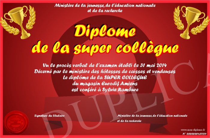Envoyez par email votre Diplôme de la super collègue personalisé